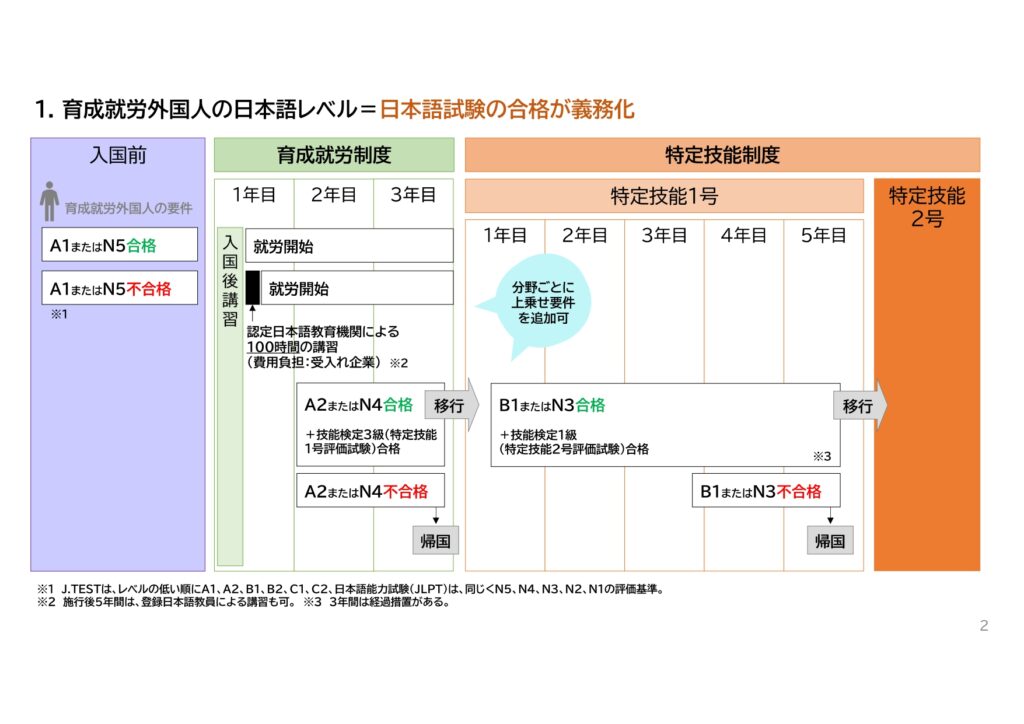 | 日本語能力水準 | 就労前または1年目:J.TESTのA1またはJLPTのN5に合格 終了時:J.TESTのA2またはJLPTのN4相当に合格 |