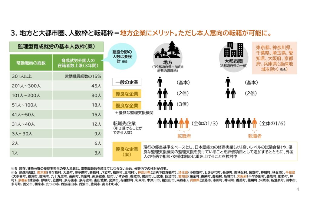 優良企業を転籍先とした転籍者の人数枠は、通常は在籍する育成就労外国人の6分の1とするが、地方では3分の1以下まで緩める。